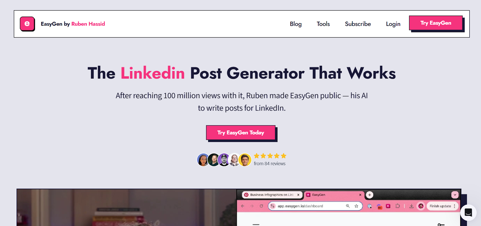 EasyGen is a LinkedIn post generator built from real-world experience creating content that resonates. Designed to help you craft posts effortlessly, it offers AI-driven suggestions tailored to your voice and audience.